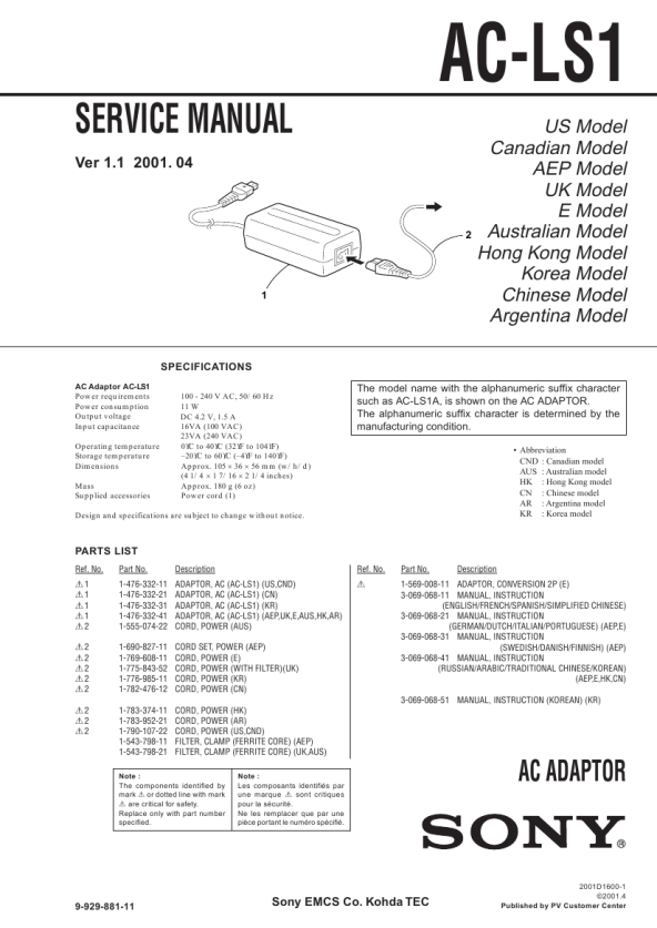 Ref. No. 01 01 01 01 02 02 02 02 02 02 02 02 02 Part No. 1-476-332-11 1-476-332-21 1-476-332-31 1-476-332-41 1-555-074-22 1-690-827-11 1-769-608-11 1-775-843-52 1-776-985-11 1-782-476-12 1-783-374-11 1-783-952-21 1-790-107-22 1-543-798-11 1-543-798-21 Description ADAPTOR, AC (AC-LS1) (US,CND) ADAPTOR, AC (AC-LS1) (CN) ADAPTOR, AC (AC-LS1) (KR) ADAPTOR, AC (AC-LS1) (AEP,UK,E,AUS,HK,AR) CORD, POWER (AUS) CORD SET, POWER (AEP) CORD, POWER (E) CORD, POWER (WITH FILTER)(UK) CORD, POWER (KR) CORD, POWER (CN) CORD, POWER (HK) CORD, POWER (AR) CORD, POWER (US,CND) FILTER, CLAMP (FERRITE CORE) (AEP) FILTER, CLAMP (FERRITE CORE) (UK,AUS)