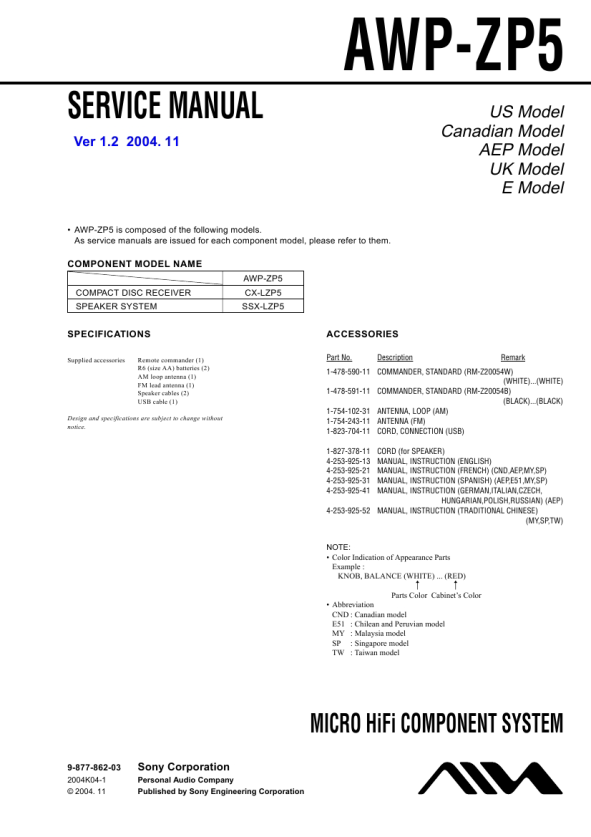Part No. Description Remark 1-478-590-11 COMMANDER, STANDARD (RM-Z20054W) (WHITE)...(WHITE) 1-478-591-11 COMMANDER, STANDARD (RM-Z20054B) (BLACK)...(BLACK) 1-754-102-31 ANTENNA, LOOP (AM) 1-754-243-11 ANTENNA (FM) 1-823-704-11 CORD, CONNECTION (USB) 1-827-378-11 4-253-925-13 4-253-925-21 4-253-925-31 4-253-925-41 CORD (for SPEAKER) MANUAL, INSTRUCTION (ENGLISH) MANUAL, INSTRUCTION (FRENCH) (CND,AEP,MY,SP) MANUAL, INSTRUCTION (SPANISH) (AEP,E51,MY,SP) MANUAL, INSTRUCTION (GERMAN,ITALIAN,CZECH, HUNGARIAN,POLISH,RUSSIAN) (AEP) 4-253-925-52 MANUAL, INSTRUCTION (TRADITIONAL CHINESE) (MY,SP,TW) NOTE: � Color Indication of Appearance Parts Example : KNOB, BALANCE (WHITE) ... (RED) R R Parts Color Cabinet�s Color � Abbreviation CND : Canadian model E51 : Chilean and Peruvian model MY : Malaysia model SP : Singapore model TW : Taiwan model