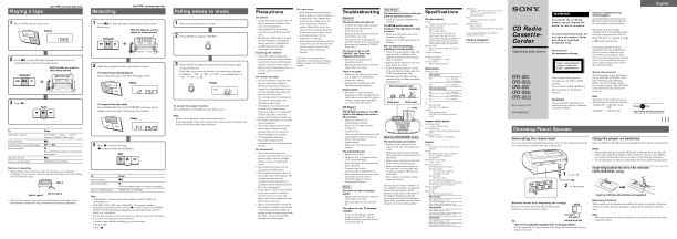 "MEGA BASS" appears in the display. To return to normal sound, press the button again. To Press VOLUME +, � (VOL +, � on the remote, CFD-S32/S32L only) x u (X on the remote, CFD-S32/S32L only) Press the button again to resume play after pause. go to the next track go back to the previous track remove the CD turn on/off the player > . Z PUSH OPEN/CLOSE OPERATE (or POWER)