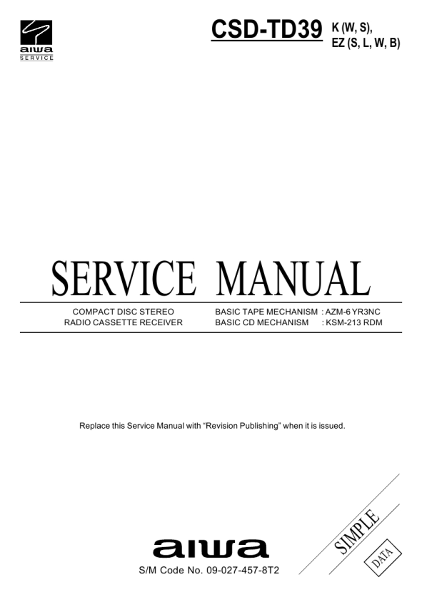 COMPACT DISC STEREO RADIO CASSETTE RECEIVER BASIC TAPE MECHANISM : AZM-6 YR3NC BASIC CD MECHANISM : KSM-213 RDM Replace this Service Manual with �Revision Publishing� when it is issued.