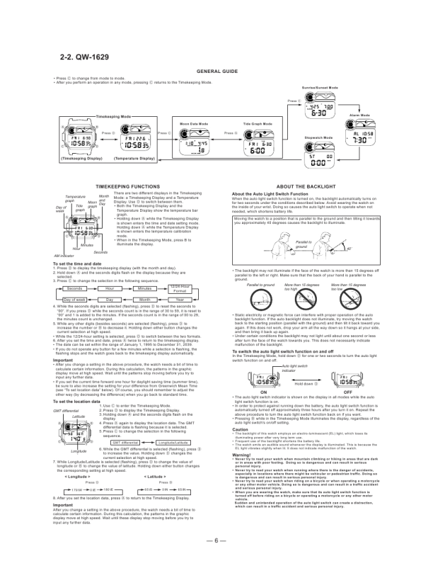 � Never try to read your watch when mountain climbing or hiking in areas that are dark or in areas with poor footing. Doing so is dangerous and can result in serious personal injury. � Never try to read your watch when running where there is the danger of accidents, especially in locations where there might be vehicular or pedestrian traffic. Doing so is dangerous and can result in serious personal injury. � Never try to read your watch when riding on a bicycle or when operating a motorcycle or any other motor vehicle. Doing so is dangerous and can result in a traffic accident and serious personal injury. � When you are wearing the watch, make sure that its auto light switch function is turned off before riding on a bicycle or operating a motorcycle or any other motor vehicle. Sudden and unintended operation of the auto light switch can create a distraction, which can result in a traffic accident and serious personal injury.