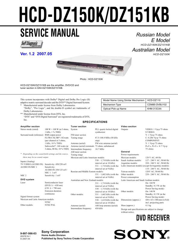 8. Demo Play Out It is a mode to release the demonstration reproduct by the dedicated demonstration disc. 1. During playback the DEMO Disc, press the x and H buttons for five seconds simultaneously. 2. The message �DEMO OFF� is displayed, a mode to reproduct the demonstration is released. 9. Protection Factor (SD Detection/DC Detection) Identification Test Mode When an error is detected, the FL tube alternately displays �PROTECTOR h PUSH POWER�. Press the ?/1 button. r * Buttons other than the ?/1 button are invalid. �STANDBY� blinks three times on the FL tube. r The protection release state (POWER OFF) is established. (No FL tube display) r Press the ?/1 button. The power to the system turns on, and the normal operation is established. (Restore) During the protection state: 1. If the AC plug is connected or disconnected during the protection state, the protection state is released, and the normal operation is established. (The protection state is not maintained.) 2. The protection factor is displayed by pressing the FUNCTION , A and > buttons at the same time during the protection state (during the �PROTECTOR h PUSH POWER� display). k When SD is detected: Repeats �SD DETECT h PUSH POWER�. k When DC is detected: Repeats �DC DETECT h PUSH POWER�. PL: SD detection When the �L� output from the SD (shutdown) port on the SMASTER POWER Driver is detected, the power system other than that of the FL tube is turned off, and the protection state is established. DC detection When the �L� output from the power/speaker error detection circuit (DC detection port) is detected for two seconds continually, the power system other than that of the FL tube is turned off, and the protection state is established. 10. Color System Change-over (Except Mexican and Latin American models) It is a mode to switch the color system (PAL/NTSC). Procedure: 1. Press the ?/1 button to turn the power on 2. Press the FUNCTION button to set the function �DVD�. 3. Press the ?/1 button to turn the power off. 4. While pressing the X button, press the ?/1 button simultaneously. 5. Each time you perform this operation the color system toggles between PAL and NTSC. �NTSC� lights up in the front display when �NTSC� is selected.