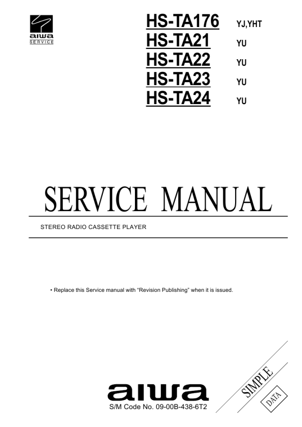 ! C = ! SAFTY PARTS = Components marked All components used on this model at the production line are shown in this service manual. However, please note that not all components will be available as spare parts for after-sales service. Components marked S and O are designated as spare parts for service and will be stocked at the spare parts centers. Components marked X and R are not designated as spare parts for after sales service, and will not be stocked at the spare parts centers. K NO. = Only use japanese. !C O O O O O O O O X X UNIT NAME SCREW SCREW SCREW SCREW SCREW SCREW SCREW SCREW TAPE TRANSPORT TAPE TRANSPORT REF NO. PARTS CODE K NO. DESCRIPTION 87-067-815-110 0E S-SCREW,VT+1.4-3 87-067-815-110 0E S-SCREW,VT+1.4-3 87-067-815-110 0E S-SCREW,VT+1.4-3 87-067-815-110 0E S-SCREW,VT+1.4-3 87-B10-044-010 0E V+1.7-6.5 87-B10-044-010 0E V+1.7-6.5 87-B10-044-010 0E V+1.7-6.5 87-B10-044-010 0E V+1.7-6.5 M8-4ZM-283-070 -- 4ZM-2 P19NC M8-4ZM-283-070 -- 4ZM-2 P19NC M8-4ZM-283-070 -- 4ZM-2 P19NC M8-4ZM-283-070 -- 4ZM-2 P19NC CR CR CR CR HL HL HL HL SUFFIX YUBLAC YUBGLC YUBDC YUBVC YUBLAC YUBGLC YUBDC YUBVC YUBLAC YUBGLC YUBDC YUBVC MODEL NAME HS-TA21 HS-TA22 HS-TA23 HS-TA24 HS-TA21 HS-TA22 HS-TA23 HS-TA24 HS-TA21 HS-TA22 HS-TA23 HS-TA24