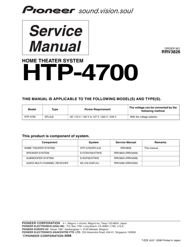 PIONEER CORPORATION 4-1, Meguro 1-chome, Meguro-ku, Tokyo 153-8654, Japan PIONEER ELECTRONICS (USA) INC. P.O. Box 1760, Long Beach, CA 90801-1760, U.S.A. PIONEER EUROPE NV Haven 1087, Keetberglaan 1, 9120 Melsele, Belgium PIONEER ELECTRONICS ASIACENTRE PTE. LTD. 253 Alexandra Road, #04-01, Singapore 159936 PIONEER CORPORATION 2008