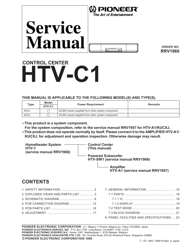 Many electrical and mechanical parts in the appliance have special safety related characteristics. These are often not evident from visual inspection nor the protection afforded by them necessarily can be obtained by using replacement components rated for voltage, wattage, etc. Replacement parts which have these special safety characteristics are identified in this Service Manual. Electrical components having such features are identified by marking with a on the schematics and on the parts list in this Service Manual. The use of a substitute replacement component which does not have the same safety characteristics as the PIONEER recommended replacement one, shown in the parts list in this Service Manual, may create shock, fire, or other hazards. Product Safety is continuously under review and new instructions are issued from time to time. For the latest information, always consult the current PIONEER Service Manual. A subscription to, or additional copies of, PIONEER Service Manual may be obtained at a nominal charge from PIONEER.
