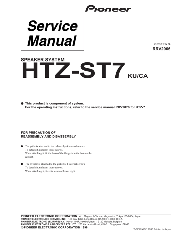 Cabinet Grille Grille Cloth Grille Frame Speaker Wire Connector (Red) Connector (White) Cord Packing (for Cabinet, Grille width) Packing (for Cabinet, Grille length) Packing (for Screw) Damper Input Terminal Stamped Model Label Model Label Acoustic Absorbent (for Grille Rib) Acoustic Absorbent (for Cabinet) Speaker Screw (for Speaker) Screw (for Cabinet) Nut M4 (for Cabinet) Nut M3 (for Stand)