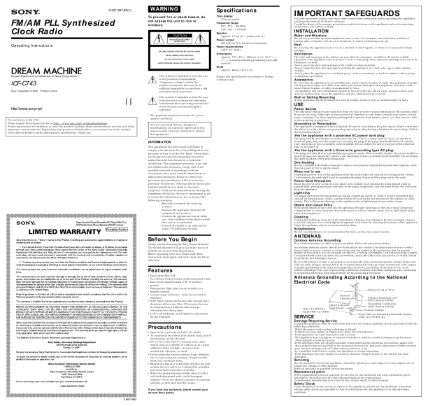 Should any problem occur with the unit, make the following simple checks to determine whether or not servicing is required. If the problem persists, consult your nearest Sony dealer. The clock does not show the correct time. � Has an electrical power outage lasting more than 1 minutes occurred? The radio or buzzer alarm does not sound at the preset alarm time. � Has the desired radio or buzzer alarm been activated? (i.e. Is � A RADIO � or � B SOUND � displayed?) The radio alarm is activated but no sound comes on at the preset alarm time. � Has VOLUME been adjusted?