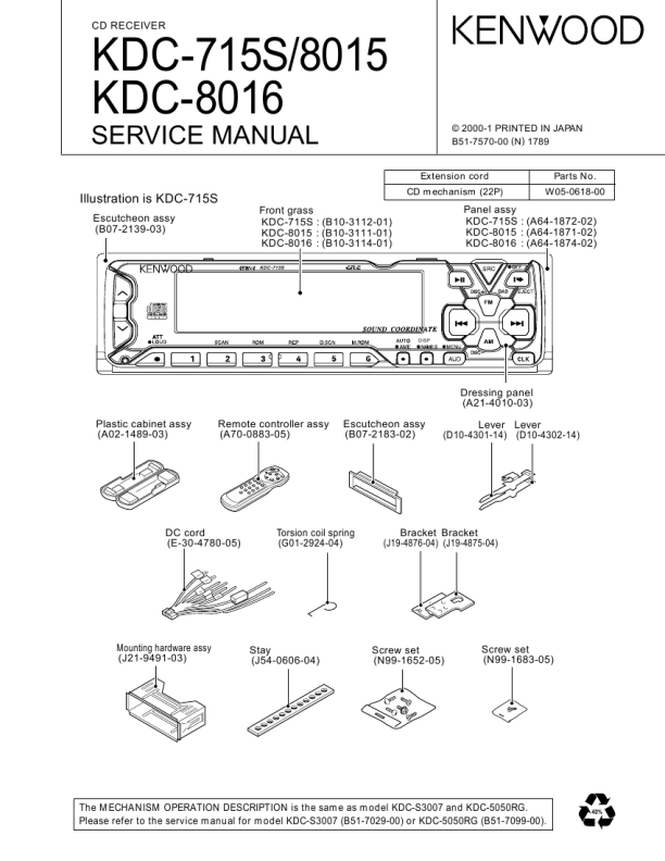 13. Simplified method for clearing the security code (Only for type K) (1) When code is requested, continue pressing VOL UP key for three seconds while pressing the DISP key. (--- disappear.) (2) Input "KCAR," using the remote controller (the same as the 98 Model) � Press Tenkey 5 twice and then press track-up key. (Inputting "K") � Press Tenkey 2 three times and then press trackup key. (Inputting "C") � Press Tenkey 2 once and then press track-up key. (Inputting "A") � Press Tenkey 7 twice and then press track-up key. (Inputting "R") (3) Then, the security is released and the unit goes into the Tuner Mode. 14. Writing MASK KEY on line (E2PROM in initial condition) (1) While pressing the FM key and Preset 6 key, press reset key to enter the test mode. (2) Press AUDIO key for full one second to put the unit into the menu mode. (3) Select the "MASK KEY," using the FM key or AM key. (4) Press on the track up/down key to display "TRANSMIT 1." (5) Point the MASK KEY to the light receptor and press it for 0.5 second or longer. (6) When "TRANSMIT 2" is displayed, press MASK KEY for 0.5 second or longer. When this is conducted, the counter codes for the first time and the second time will not be compared. (7) When "APPROVED" is displayed, writing is completed. time the demonstration mode is set and the test mode is released. Note: After an elapse of 30-minute period, during which no code is written, an error is effected and the device will power off. 15. Releasing MASK KEY requests (When reset or backup is off when MASK KEY is approved) (1) When power is turned on, "TRANSMIT 1" is displayed and the unit goes into MASK KEY request mode. (2) Point the MASK KEY to the light receptor and press it for more than 3 seconds (until the level display indicates full) (3) When "TRANSMIT 2" is displayed, press the MASK KEY again for more than three seconds. At this point, when "TRANSMIT 1" is displayed, repeat the process in (2) above for the second time. (4) When "APPROVED" is displayed, MASK KEY is approved and the unit turns power on. 17. Clearing from the MASK KEY (1) While pressing FM key and Preset 6 key at the same time, press RESET to enter the test mode. (2) Press the AUDIO key for full one second to put the unit into the menu mode. (3) Select MASK KEY, using track up/down key. (4) Press on the FM key or AM key for full two seconds and the unit will display "TRANSMIT 1." (5) Point the MASK KEY release controller to the light receptor and press it for 3 seconds or longer. (Until the level display indicates full.) (6) When "TRANSMIT 2" is displayed, press MASK KEY for 3 seconds or longer for the second time. If "TRANSMIT 1" is displayed, start again from (5) above. (7) When "APPROVED" is displayed, E2PROM is cleared. The unit goes back to the condition described in Line 14: Writing MASK KEY on line (E2PROM in initial condition) 18. Other � Automatic panel closing does not occur in case a TAPE, CD, or MD is inserted. � Panel is opened/closed when ATT key is turned On/Off. ( A remote controller is used when turning ATT on.) � The DNPP/SBF key of the remote controller (RC-510) is used for tuning the menu mode On/Off. � The OPEN/CLOSE key of the remote controller (RC510) is used for tuning the audio mode On/Off. � The feed on the menu will be feeds only for necessary features. � "CODE OFF" and other displays will not be issued when the power is turned on. � The dimmer of the FL model and contrast on the LCD model can be adjusted only for 0/5/10 by the UP/ DOWN key. 16. Initializing MASK KEY (returning to the default condition from MASK KEY approved state) (1) While pressing the FM key and Preset 6 key at the same time, press RESET to enter the test mode. (2) "TRANSMIT 1" is displayed and the unit goes into MASK KEY request mode. The display at this point will be "**" instead of "[ ]". (3) Use MASK KEY release remote controller for more than three seconds. (4) When "TRANSMIT 2" is displayed, press the MASK KEY for more than three seconds for the second time. (5) When "APPROVED" is displayed, the MASK KEY is released and the demonstration mode is set. Then, the test mode is released, returning the unit into default condition.