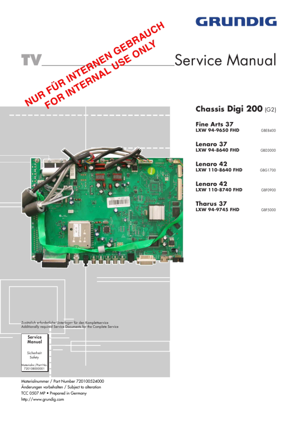 Aufruf des Service-Menüs: Taste " i " (EASY DIALOG) Aufruf der Dialogzeile: Tasten "P+" / "P-" �> "OK" Einstellung in der Dialogzeile ändern: Tasten " � " / " � " �> "OK" Zurück ins vorherige Menü: "blaue" Taste Beenden des Menüs: Taste " i " Servicemenü für Händler (Codezahl): "8500" 1. Einschaltfunktionen 1.1 Programmsperre (Kindersicherung) Die Tastenfolge "7038580" hebt die persönliche Kennzahl auf. 1.2 Software-Versionsnummer Das Menü "EASY DIALOG" aufrufen. Durch Betätigen der "grünen" Taste wird die Software-Versionsnummer angezeigt. 1.3 Flashprogrammierung Den letzten Stand der Software sowie die Programmier-Anleitung finden Sie im Service Portal "http://service.grundig.de" �> "Softwaredownload" �> Suchbegriff (Geräte-Bestellnummer) �> "Tip". 1.4 Direkte Display-Typ-Einstellung (ab Software 11) Ist die Menüdarstellung auf Grund falscher Display-Typ-Einstellung nicht mehr möglich, können Sie mit "Short-cuts" die korrekte Einstellung vornehmen. Vor und nach der Direkteingabe muss das Gerät aus- und wieder eingeschaltet werden! Nach 20s mit den Tasten " i ", "P" und der 2-stelligen Zahl den gewünschten Display-Typ gemä� Display-Label einstellen. Folgende Ziffern sind den jeweiligen Display-Typen zugeordnet: 00 01 02 03 LPL AUO LPL CMO LC320W01-SL01 T315XW01 V2 LC370WU1-SL01 (Default) V370H1-L0A