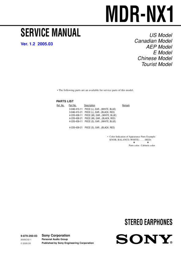 Ref. No. Part No. 3-046-415-11 3-046-415-21 4-220-438-11 4-220-438-21 4-220-439-11 Description PIECE (L), EAR...(WHITE, BLUE) PIECE (L), EAR...(BLACK, RED) PIECE (M), EAR...(WHITE, BLUE) PIECE (M), EAR...(BLACK, RED) PIECE (S), EAR...(WHITE, BLUE) Remark