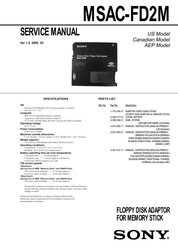 Ref. No. Part No. Description (FLOPPY DISK ADAPTOR for MEMORY STICK) 3-058-277-01 COVER, BATTERY 3-058-284-21 DISK, SYSTEM (DRIVER SOFTWARE (CD-ROM)) 3-061-609-11 MANUAL, INSTRUCTION (ENGLISH,FRENCH) (US,Canadian) 3-061-609-21 MANUAL, INSTRUCTION (ENGLISH,FRENCH, GERMAN,ITALIAN,DUTCH,SPANISH, PORTUGUESE,SWEDISH,DANISH,FINNISH, RUSSIAN,TRADITIONAL CHINESE,KOREAN, ARABIC) (AEP) 3-061-610-11 MANUAL, INSTRUCTION (ENGLISH,FRENCH, GERMAN,SPANISH,DUTCH,SWEDISH, ITALIAN,PORTUGUESE,DANISH,FINNISH, RUSSIAN,ARABIC,TRADITIONAL CHINESE, KOREAN) (US,Canadian,AEP)