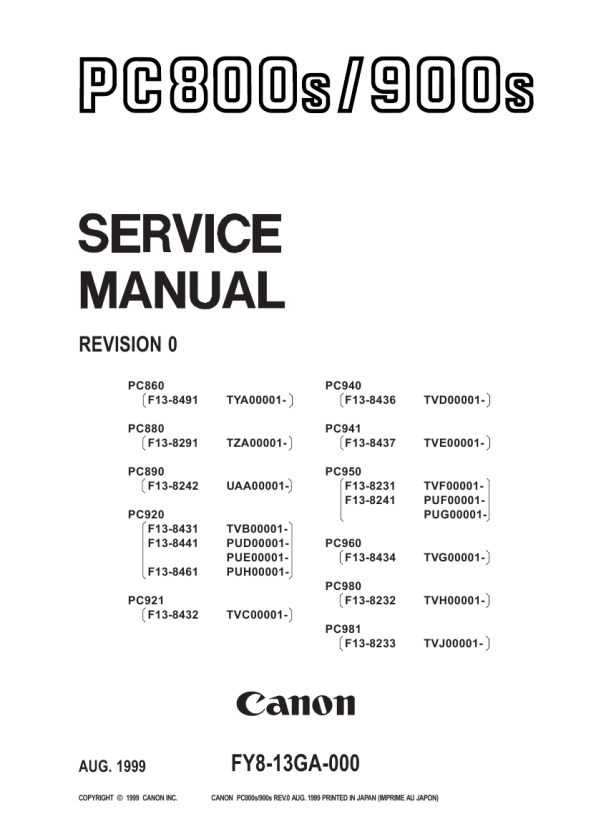 CANON PC800s/900s REV.0 AUG. 1999 PRINTED IN JAPAN (IMPRIME AU JAPON)