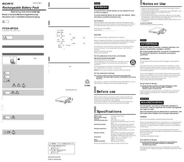 Lesen Sie diese Anleitung vor Inbetriebnahme des Akkus bitte genau durch, und bewahren Sie sie zum späteren Nachschlagen sorgfältig auf. Informationen zum Laden finden Sie in den mit dem Notebook von Sony gelieferten Handbüchern. Der Akku PCGA-BP52A von Sony wurde für das Notebook von Sony konzipiert. Er lä�t sich unter Umständen jedoch bei einigen Modellen nicht einsetzen.