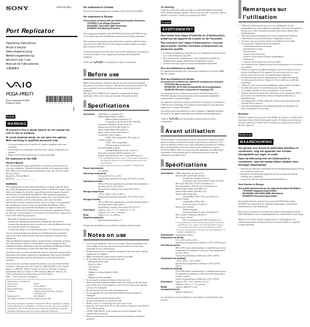 � Use the port replicator with an AC adapter that is compatible with your notebook. See also the manuals provided with your Sony notebook for more information. � To disconnect the port replicator completely from the main voltage, unplug the AC adapter. � Make sure that the socket outlet is easily accessible. � Do not place the unit in locations that are: � Extremely hot or cold � Dusty or dirty � Very humid � Vibrating � Subject to strong magnetic fields � Sandy � Subject to direct sunlight � Do not apply mechanical shock or drop the unit. � Make sure that nothing metallic comes into contact with the metal parts of the unit. If this happens, a short-circuit may occur and the unit may be damaged. � Do not operate the unit with a damaged cord. � Do not operate the unit if the unit itself has been dropped or damaged. � Always keep the metal contacts clean. � Do not disassemble or convert the unit. � While in use, it is normal for the unit to get warm. � Keep the unit away from TV or AM receivers, because it can disturb TV or AM reception. � i.LINK, USB, and PC Card connectors are not supplied with Limited Power Sources. � When connecting or disconnecting the port replicator, handle it carefully.