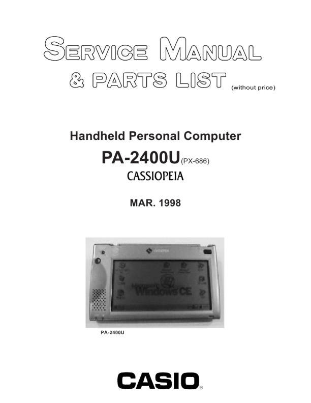 The CASSIOPEIA has a dual power supply that consists of a battery pack (or ,main batteries) and back-up batteries. Be sure to load the battery pack (or the main batteries) and back-up batteries before using the CASSIOPEIA. Also, charge the battery pack (or replace batteries) as soon as possible at the first sign of low power. Important! � Use the battery pack or two AA-size alkaline batteries for the main power supply, and a CR2032 lithium battery and a IVR 2430 battery for the back-up power supply. Never use any other type of battery with the CASSIOPEIA. � The rechargeable back-up battery (IVR2430) is charged by power from the main power supply. The rechargeable battery is provided in order to prevent premature discharging of the primary back-up battery (CR2032). Never remove the rechargeable back-up battery. � Never remove both the battery pack (or the main batteries) and the primary back-up battery from the CASSIOPEIA at the same time. If you do, data stored in memory can be corrupted or lost entirely. � Never remove the primary back-up battery from the CASSIOPEIA while the battery pack is full discharged (or the main batteries are dead). If you do, data stored in memory can be corrupted or lost entirely. � Whenever the battery pack (or the main batteries) and the primary back-up battery both require replacement, be sure to replace the battery pack (or the main batteries) first, before replacing the back-up battery. � Be sure to watch out for signs of low battery power. Recharge the battery pack or replace main batteries as soon as possible after the message shown below appears on the display. �Your main batteries are running very low on power. Please change the batteries at your next opportunity.� Replace the primary back-up battery as soon as possible after the message shown below appears. �Your backup battery is very low or missing. Data loss may result from failure to replace the battery very soon.� Failure to replace batteries when they are low can result in corruption or loss of data stored in memory.