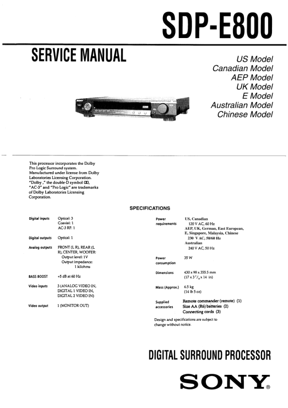 � IC119 DOLBY Surround Digital Signal Processor (SSP424023FJ88) Pin No. 1 2 3 4 5 6 7 8 9 10 11 12 13 14 15 16 17 18 19 20 21 22 23 24 25 26 27 28 29 30 31 32 33 34 35 36 37 38 39 40 MCS0 MA15 MA14 MA13 AVCC MA12 AGND QVCC QGND MA11 MA10 MA9 MA8 AGND MA7 AVCC MA6 MA5 MA4 AGND MA3 MA2 MA1 MA0 SCK/SCL EXTAL QVCC QGND PINIT PGND PCAP PVCC SGND MISO/SDA RESET MODA/IRQA MODB/IRQB MODC/NMI SVCC Pin Name AGND I/O � O O O O � O � � � O O O O � O � O O O � O O O O I I � � I � I � � I I I I I � SPI serial clock signal input from system controller External frequency input (3 MHz) Power supply for internal logic (+5V) Ground for internal logic PLL initialize input (Fixed at �L�) Ground for PLL PLL filter input (Connected to 0.01 µF capacitor) Power supply for PLL (+5V) Ground for serial port Master data signal input from system controller Reset signal input from system controller Mode select A (Fixed at �H�) Mode select B (Fixed at �L�) Mode select C (Fixed at �H�) Power supply for serial port (+5V) Address data output to S-RAM Ground for address bus buffer Address data output to S-RAM Ground for address bus buffer Address data output to S-RAM Power supply for address bus buffer (+5V) Address data output to S-RAM Address bus buffer power supply (+5V) Address data output to S-RAM Ground for address bus buffer Power supply for internal logic (+5V) Ground for internal logic Address data output to S-RAM Address buffer ground Chip select 0 output to S-RAM (Not used) Function