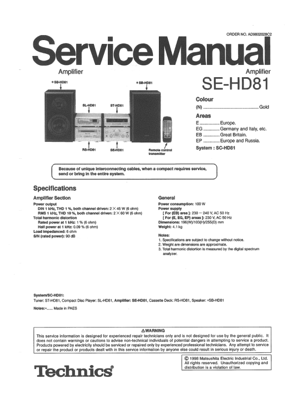 Descripción del TECHNICS SEHD81 Manual de Servicio
