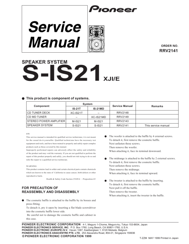 Cabinet Inner Baffle Network ASSY Input Terminal Acoustic Absorbent Punching Net Cosmetic Baffle ASSY Cosmetic Baffle Cosmetic Ring Speaker (Woofer) Speaker (Mid-range) Screw (for Woofer) Stamped Model Label Model Label