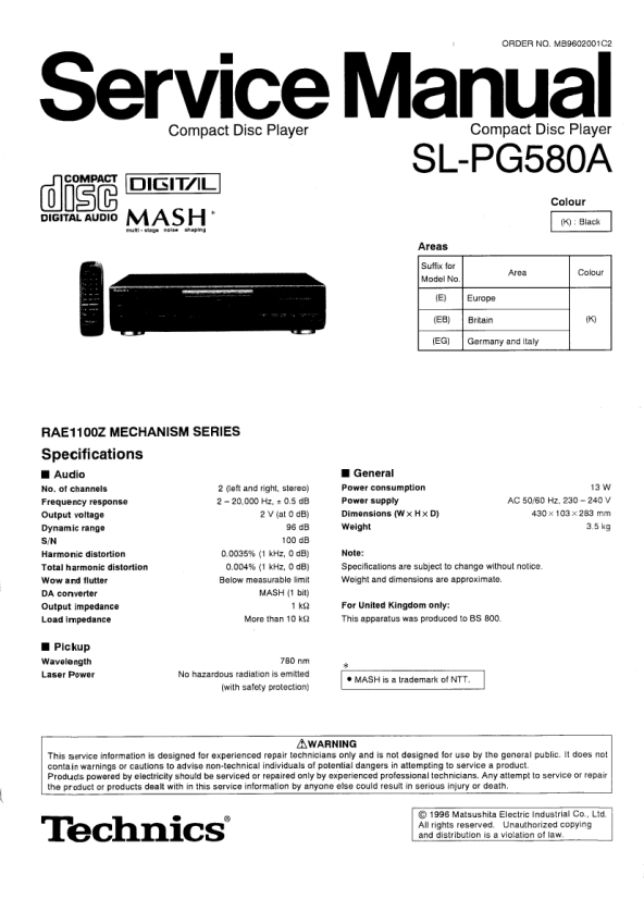 Descripción del TECHNICS SLPG580A Manual de Servicio