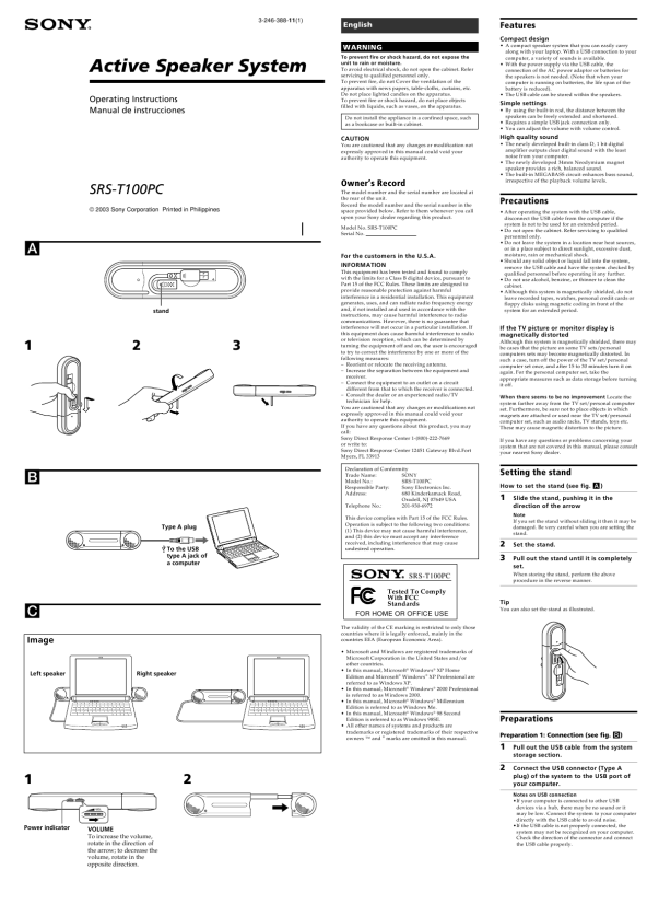 â�¢ Cuando verifique la conexión entre el sistema y el ordenador, compruebe el administrador de dispositivos del ordenador. Si desea obtener más información, consulte el manual del ordenador. â�¢ En el caso de que el ordenador disponga de dos o más tomas USB, el sistema no puede utilizarse a la vez con otros dispositivos USB. En caso contrario, la salida de los altavoces podrÃa ser baja y podrÃan producirse saltos de sonido o ruido. Si desea obtener más información, consulte el manual del ordenador. â�¢ No se garantiza el funcionamiento con sistemas operativos Windows instalados en equipos de instalación propia, sistemas operativos Windows actualizados o sistemas operativos no compatibles. â�¢ Sony recomienda la utilización de ordenadores con una CPU Pentium II a 266 MHz o superior. Si la CPU no cumple los requisitos mÃnimos o si se ejecutan otras aplicaciones simultáneamente, la lectura de los datos podrÃa omitirse, lo que provocarÃa ruido o un sonido intermitente. â�¢ Si se utiliza un cable prolongador para una conexión USB, es posible que se produzcan fallos de funcionamiento o que la salida de los altavoces sea baja. â�¢ Si el sonido de los altavoces se emite distorsionado o con excesivo ruido, ajuste el volumen del sistema y el del ordenador mediante el panel de control. â�¢ Si el sonido de alarma del ordenador y el de reproducción no están equilibrados, ajústelos siguiendo las instrucciones del manual del ordenador. â�¢ Sony recomienda realizar una copia de seguridad de los datos importantes antes de instalar los controladores de dispositivo USB. Sony no se responsabilizará en caso de imposibilidad de uso del ordenador o de pérdida de datos debido a un funcionamiento incorrecto o a una averÃa. â�¢ Cuando utilice la función de reanudación tras suspensión (suspensión del sistema, hibernación del mismo, etc.), es posible que los altavoces del sistema no funcionen correctamente. En tal caso, reinicie la aplicación o el ordenador.