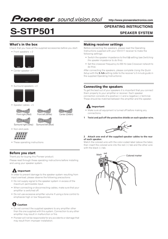 Before connecting the speakers, please read the Operating Instructions supplied with your VSX-517 receiver to make the following settings: � Switch the speaker impedance to the 6 � setting (see Switching the speaker impedance to do this). � Set the crossover frequency to 200 Hz (see Crossover network to do this).
