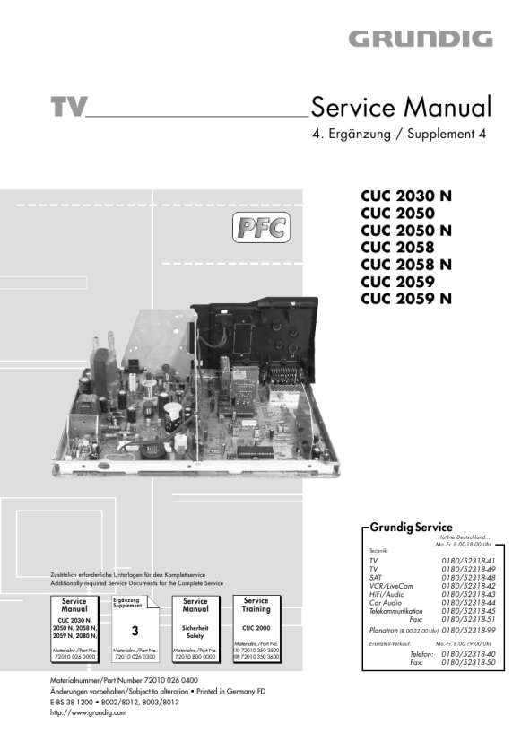 Service Manual CUC 2030 N, 2050 N, 2058 N, 2059 N, 2080 N 72010 026 0000 Chassisplatte Chassis Board Bildrohrplatte CRT Panel 29704 009 . . . . 29305 122 2300 29305 122 2500 29305 122 2800 Netzschalterplatte Mains Switch Board Keyboard Bedieneinheit Control Unit 29305 165 7100 29501 083 2500 29501 082 5900 29501 082 6100 29501 082 6200 29501 082 8200 29501 085 0800 29501 085 1800 Prozessorplatte Processor Panel Feature-Platte CTI/LTI Feature Board CTI/LTI 29305 219 1400 29305 119 3500 29305 129 0700 Panorama View Buchsenplatte Socket Board PIP-Baustein PIP Module Dolby-Surround-Platte Dolby Surround Board SAT-Baustein SAT Module 29305 129 0400 29305 008 3700 29504 106 5200 29504 104 7700 29504 106 2500 Seite / Page 3-37 Seite / Page 3-39 Seite / Page 3-36 Seite / Page 3-35 Seite / Page 3-46 Seite / Page 3-51 Seite / Page 3-55 Seite / Page 49 Seite / Page 43 Seite / Page 45 Seite / Page 47 Seite / Page 45 Seite / Page 35 Seite / Page 3-1 Seite / Page 3-41 Seite / Page 3-41 Seite / Page 3-43 Seite / Page 3-27 Seite / Page 3-26 Seite / Page 3-33 Seite / Page 35 Seite / Page 43 Seite / Page 40 Seite / Page 41 Seite / Page 43 Seite / Page 43 Seite / Page 43 Seite / Page 37 3. Ergänzung 4. Ergänzung Supplement 3 Supplement 4 CUC 2030 N, 2058 N, 2059 N, CUC 2030 N, 2050, 2050 N, 2080 N 2058, 2058 N, 2059, 2059 N 72010 026 0300 Seite / Page 8 Seite / Page 37 Seite / Page 37 Seite / Page 40 Seite / Page 48 72010 026 0400 Seite / Page 12