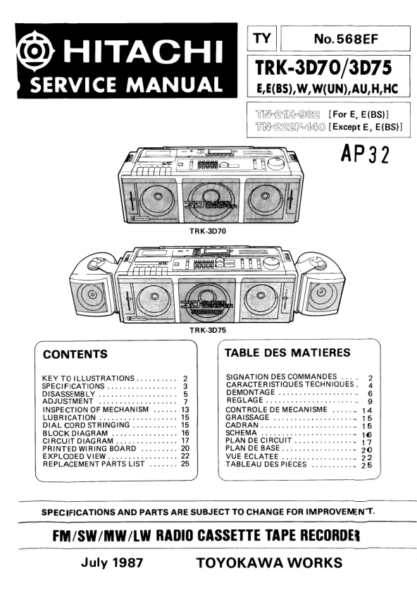 Descripción del HITACHI TRK-3D70 Manual de Servicio