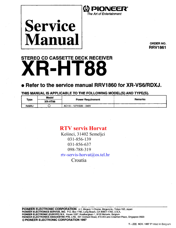 Descripción del PIONEER XRHT88 Manual de Servicio