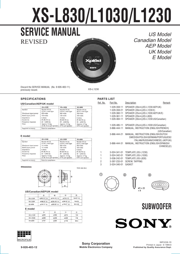 1-529-485-11 SPEAKER (25cm)(XS-L1030:US/Canadian) 3-866-444-11 MANUAL, INSTRUCTION (ENGLISH/FRENCH) (US/Canadian) 3-866-444-21 MANUAL, INSTRUCTION (ENGLISH/DUTCH/ SWEDISH/POLISH/GERMAN/PORTUGUESE/ ITALIAN/RUSSIAN/CHINESE) (AEP/UK) 3-866-444-31 MANUAL, INSTRUCTION (ENGLISH/SPANISH/ CHINESE)(E) 1 1 1 2 3 3-024-341-01 3-024-342-01 3-036-242-01 3-397-233-01 3-024-340-01 TEMPLATE (XS-L1230) TEMPLATE (XS-L1030) TEMPLATE (XS-L830) SCREW, TAPPING GASKET